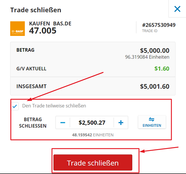 Falls Sie die Position nicht komplett, sondern nur zum Teil verkaufen wollen, dann klicken Sie zusätzlich auf das Häkchen „Den Trade teilweise schließen“.