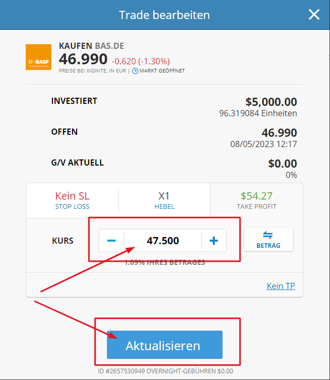 Beachten Sie bitte, dass das Limit höher sein muss als der aktuelle Kurs. Klicken Sie im Anschluss auf „Aktualisieren“.