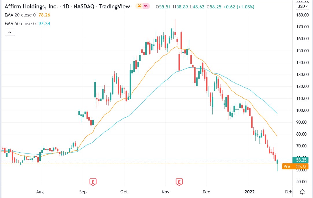 Affirm stock was down 4.70% premarket to trade at $55.51, falling from Monday’s closing price of $58.25.