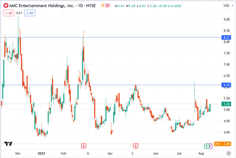 The AMC Entertainment stock price was trading down 33.65% at $3.49 after falling from Friday’s closing price of $5.26.