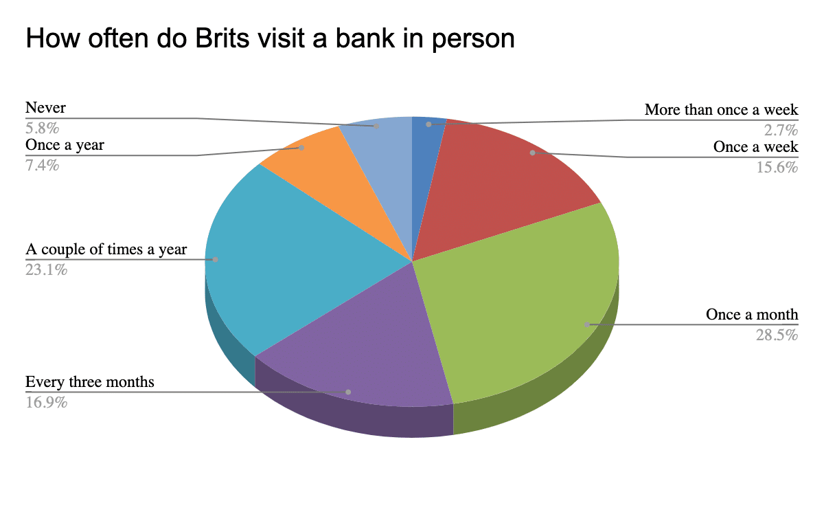 Despite access to banks becoming all the more restricted, our survey has revealed 19 per cent of people still visit a branch once a week or more while 29 percent of Brits said they visited a bank once a month. Just 6 per cent of people said they don’t go to a bank.