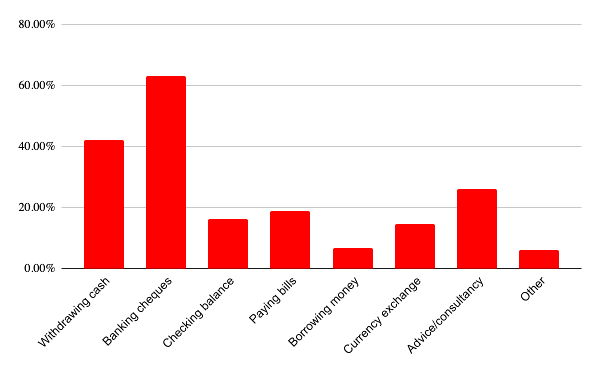 The most common reason for people visiting a bank is to pay-in cheques, followed by withdrawing cash and seeking financial advice. 20 per cent of people said they went to a branch to pay their bills.