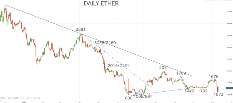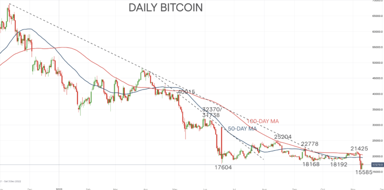 After Binance pulled out of a possible buyout of FTX, already weakened cryptocurrencies plunged lower again on Wednesday before Thursday’s rebound. The plunge lower in both Bitcoin and Ether saw moves below significant support levels, with BTC most damaged, pushing below the June bear market low at 17604, to 15585. The ETH move below the October low at 1192 to 1073, was a less damaging, but still a very negative development from a technical analysis perspective!