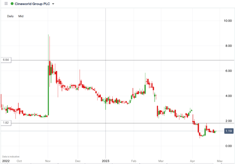 The Cineworld share price was trading up 5.08% at 1.21p, from Thursday’s closing price of 1.17p.