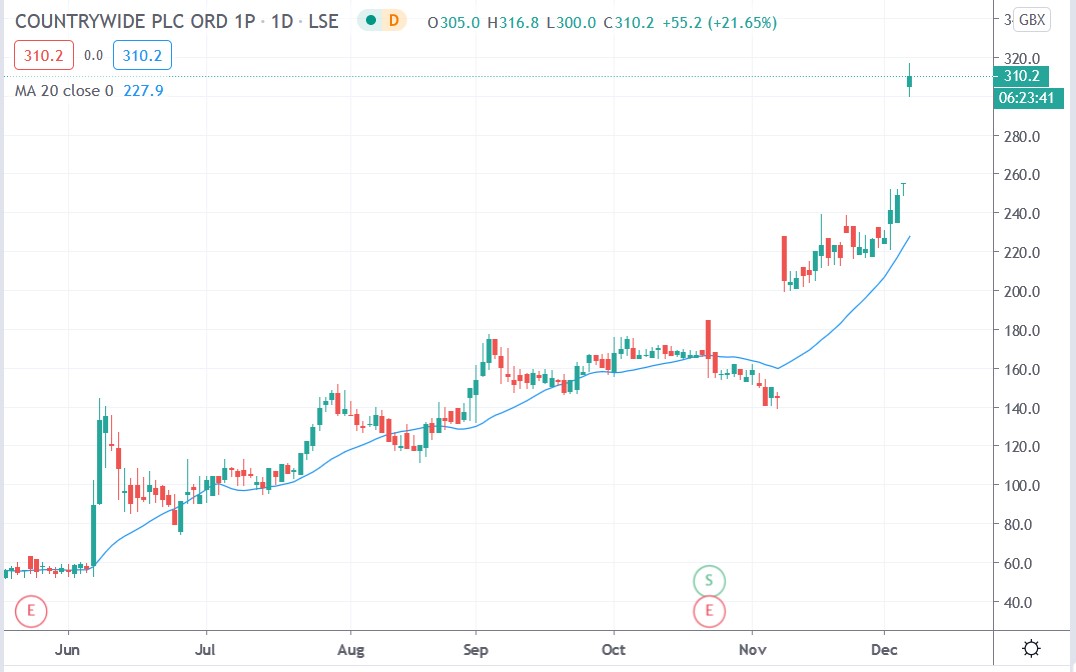 Investors were pleased with the offer as evidenced by the fact that Countrywide’s share price has rallied over 100% ever since Connells, the rival UK property firm, made its initial offer of 250p per share for the company in early November, which was rejected.