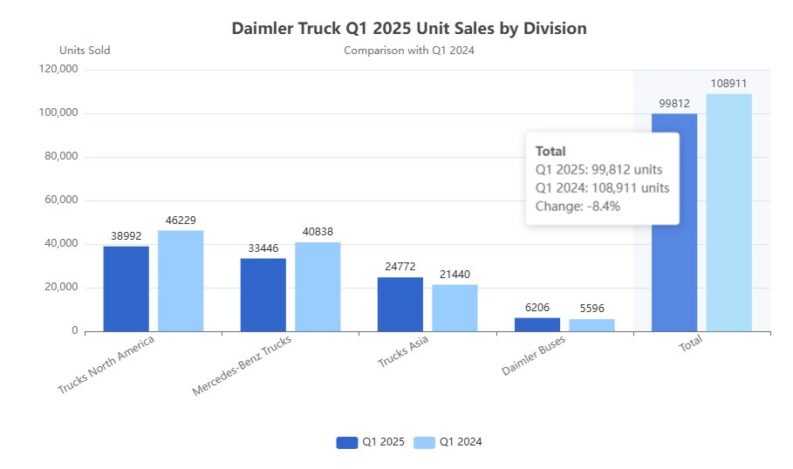 Q1 2025 unit sales highlight the company’s regional divergence. Total units sold fell 8% year-on-year to 99,812, with North America and Europe posting sharp declines (down 16% and 18%, respectively), while Asia and the Daimler Buses segment posted double-digit growth. Battery-electric vehicle sales remain a challenge, down 7% year-on-year, though the company continues to invest heavily in zero-emission platforms, including the GenH2 hydrogen truck and eActros 600.