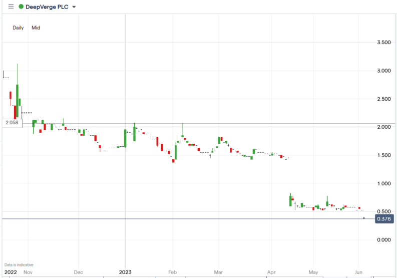 The Deepverge share price fell 28.76% to trade at 0.374p, from Friday’s closing price of 0.525p.