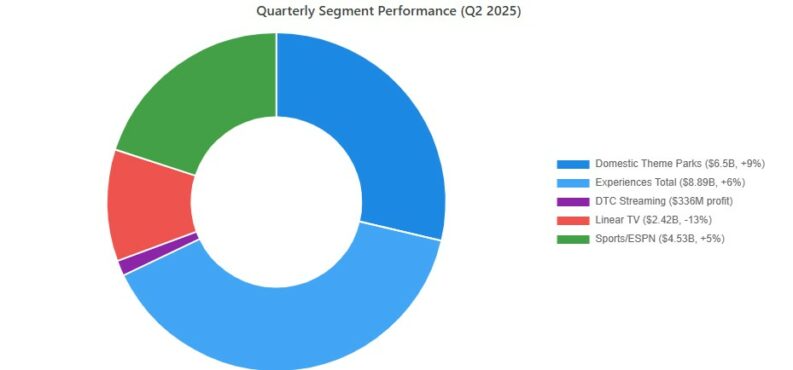 The Experiences segment, which includes theme parks, resorts, and cruise lines, has consistently been a strong performer for Disney. In the second quarter, revenue for this segment rose 6% to $8.89 billion, with domestic theme parks experiencing a 9% increase to $6.5 billion.