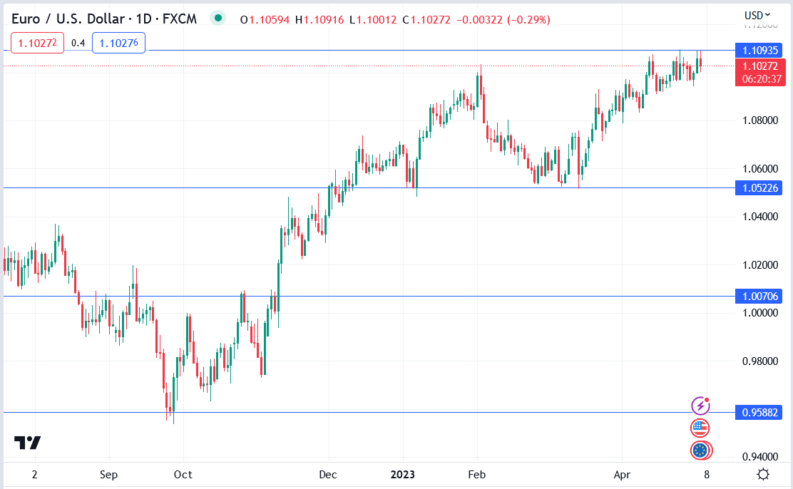The EURUSD currency pair was trading down over 60 pips after the European Central Bank hiked interest rates by 25 basis points from 3.50% to 3.75%, as expected. The euro pulled back from the resistance zone it has been trading against since mid-April.