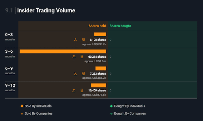 There's no information like insider information and recent share dealing by those with intimate knowledge of the firm does raise a red flag. Over the last 12 months, all insider dealing has been stock sales and 3–6 months ago there was a spike in activity.