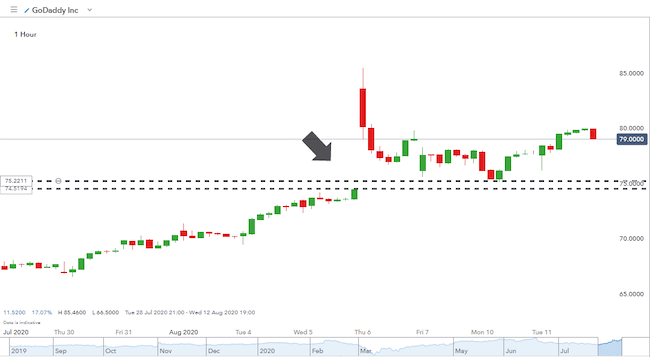 GoDaddy Inc share price – Hourly Candles – 1st August–12th August 2020