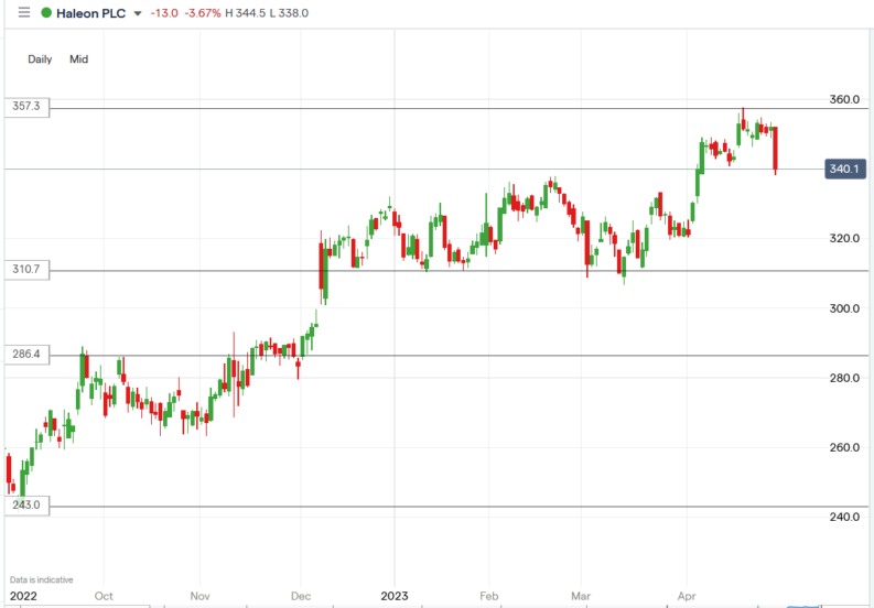 The Haleon share price fell 3.92% to trade at 338.1p, from Tuesday’s closing price of 351.9p.