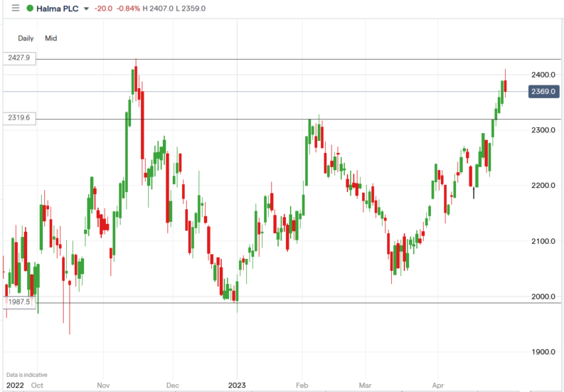 The Halma share price spiked 0.94% higher to trade at 2410.0p, from Thursday’s closing price of 2387.5p, before falling back.
