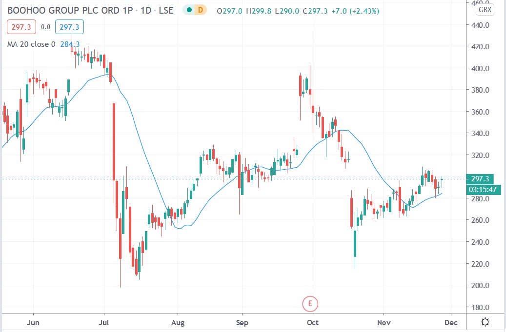 Boohoo shares today surged 3.27% to trade at 299.8p having rallied from Wednesday’s closing price of 290.3p.
