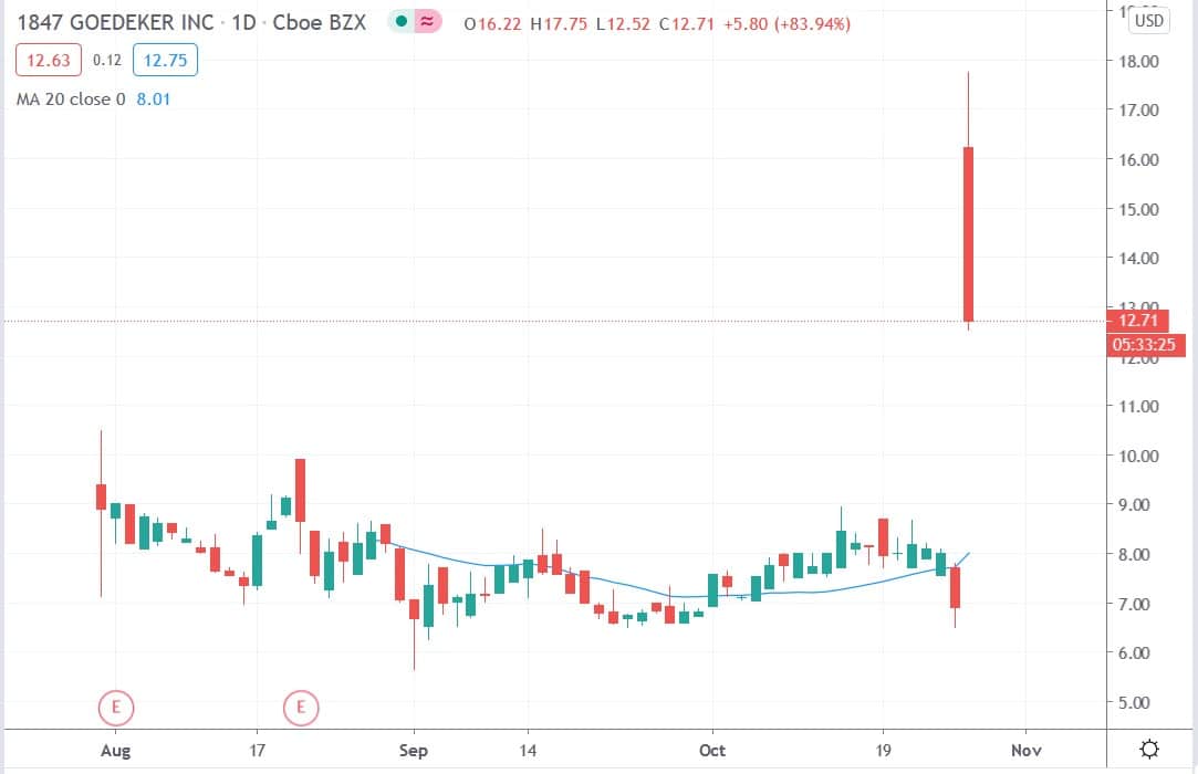 Goedeker shares today surged 156% to trade at $17.74 having gapped higher from yesterday’s closing price of $6.91.