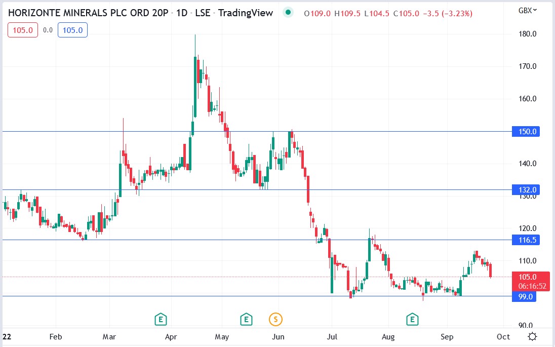 Horizonte Minerals (HZM) shares are falling towards the 99p support level previously held. However, we could get a rally higher if the level holds over the coming days and weeks.
