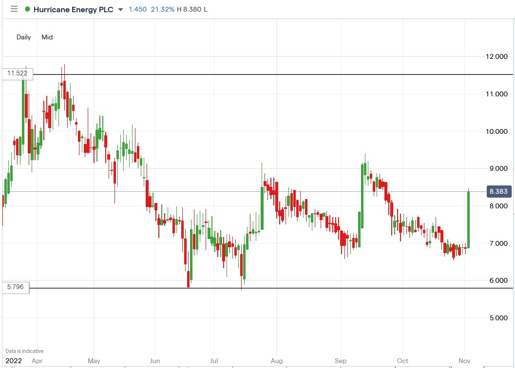 The Hurricane Energy PLC (LON: HUR) share price rallied 23.6% after announcing that it had received an unsolicited takeover offer for its entire issued share capital valuing each share at 7.7p, representing a 13% premium to its closing price on 1 November 2022.