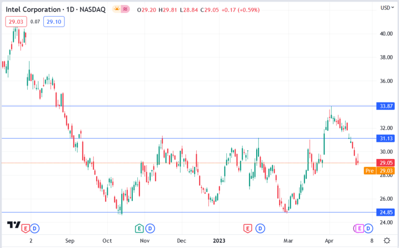 The Intel stock price has fallen 14.23% from its April 4, 2023, high of $33.87 to its current price of $29.05.