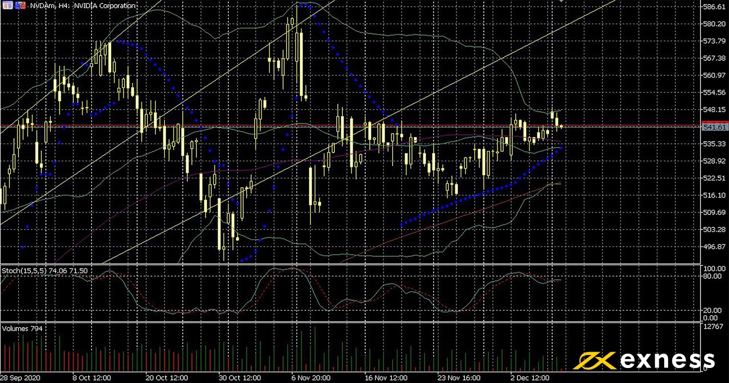 NVDA, the representative CFD based on NVIDIA Corp’s stock, continued to strengthen yesterday, reaching a monthly high at yesterday’s open of $548.88. Like some other large cap cyclical shares, NVDA has settled into a range since the start of November amid relatively lower volatility.