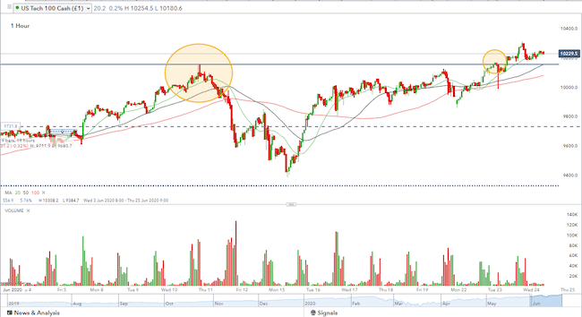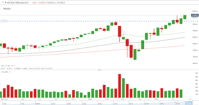 A lot of attention will be on the Nasdaq. The tech-rally has been based on highly plausible arguments that everything has changed. The June the 10th all-time-high at 10161 proved a stiff resistance to price on the way up and may offer support of any correction.