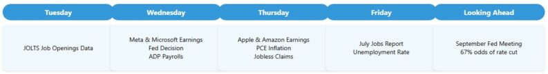 It will be hard to escape earnings news this week, with four of the Mag 7 set to report, on Wednesday and Thursday, after market close. With Meta, Microsoft, Apple, and Amazon, all coming to the table, markets will be looking for a continuation in Capex, akin to Alphabet last week, and looking for any news relating to AI.