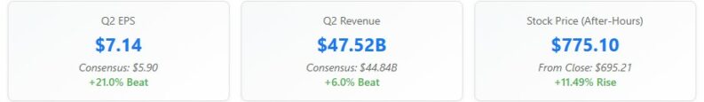 The company reported Q2 EPS of $7.14, absolutely crushing the estimate of $5.90. Revenue for the quarter reached $47.52 billion, also a significant upside beat on expectations of $44.84 billion.