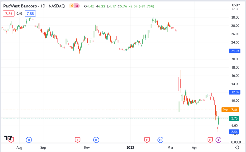 The PacWest Bancorp stock price was trading up 36.46% at $7.86, from Friday’s closing price of $5.76.