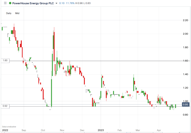 The Powerhouse Energy share price rose 6.67% to trade at 0.96p, from Friday’s closing price of 0.90p.