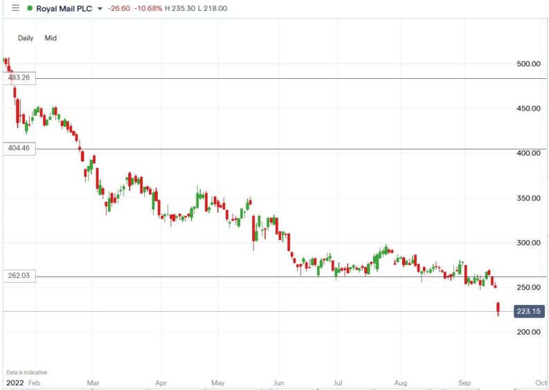 The Royal Mail (RMG) share price plunged 12.9% to trade at 217.70p, falling from Thursday’s closing price of 249.95p.