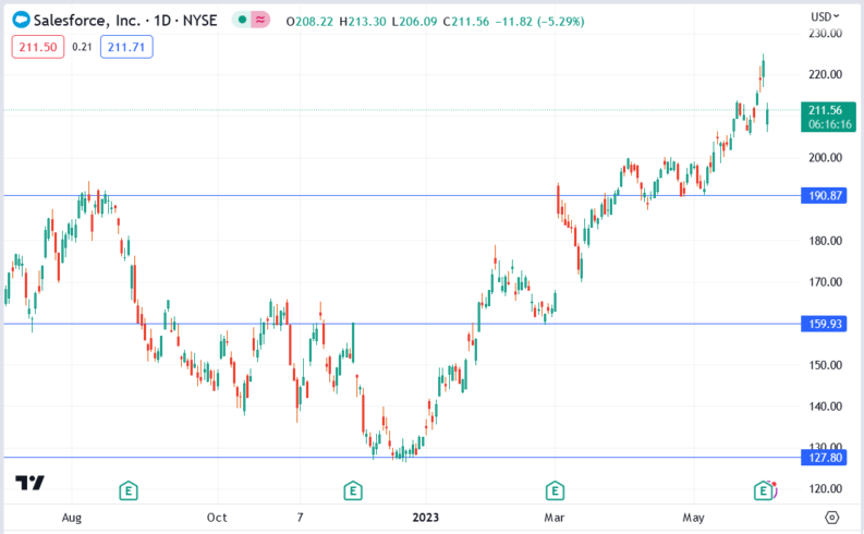 The Salesforce (CRM) share price fell 6.97% to trade at $207.70, from Friday’s closing price of $223.38.