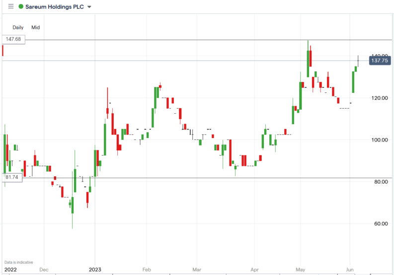 The Sareum share price edged 3.89% higher to trade at 140.25p, from Monday’s closing price of 135.00p.