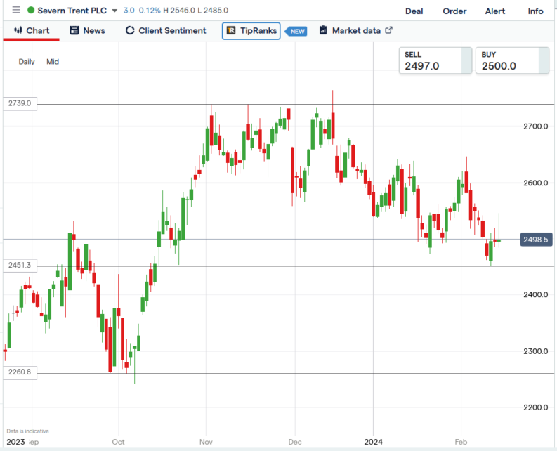 The Severn Trent share price spiked 2.00% to trade at 2545.5p from Tuesday’s closing price of 2495.5p.