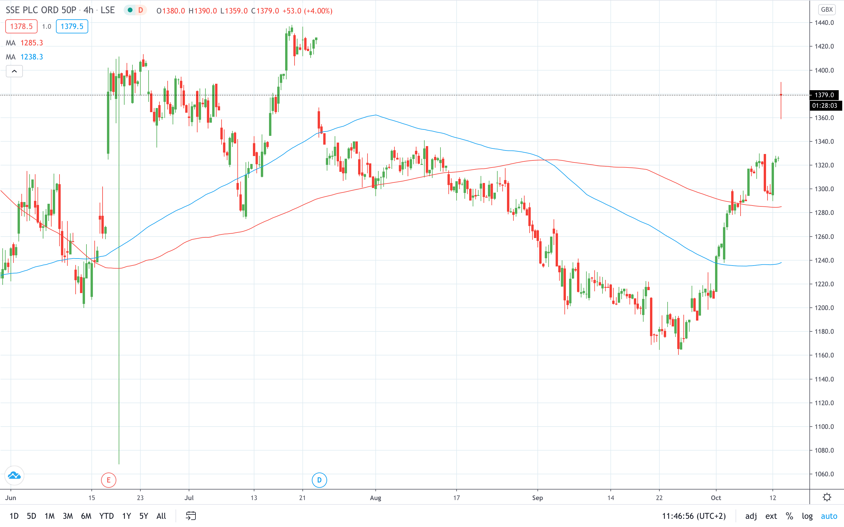 SSE share price gained 4% to trade at 1390p for the first time since July.