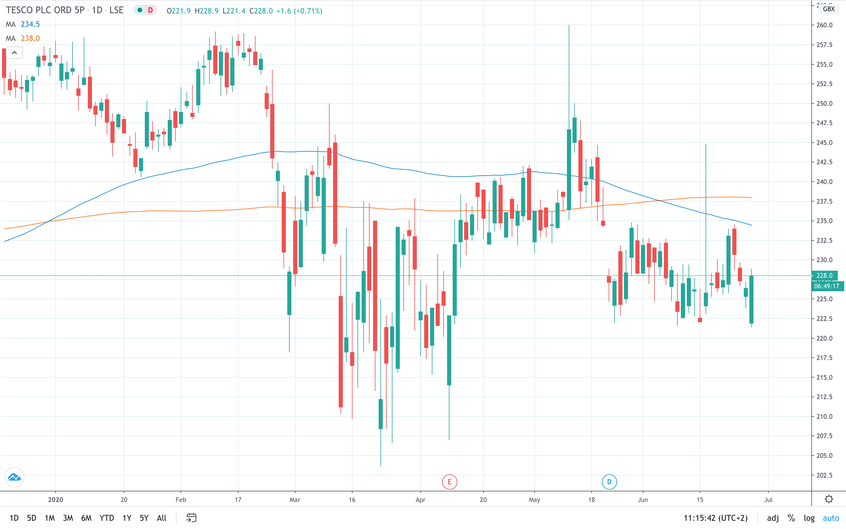 Tesco stock price gapped 2% lower at 221.9p this morning. However, the buyers have managed to push the stock into the green to trade at 227.6p.