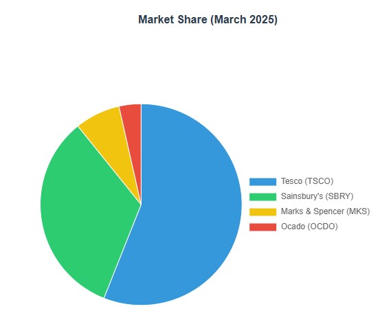 - Market Share Stability: Tesco and Sainsbury’s continue to dominate, though discounters Aldi and Lidl are steadily growing their presence, with Aldi reaching an 11% market share by March 2025.
