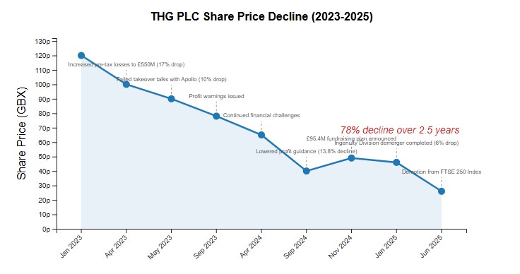 Adding to the company's challenges, THG terminated discussions with Apollo Global Management regarding a potential takeover in May 2023, citing “inadequate valuations.” This decision led to a nearly 10% drop in THG's share price, reflecting investor disappointment over the failed acquisition talks. Throughout 2023 and 2024, THG issued multiple profit warnings and revised revenue targets downward, further eroding investor confidence.