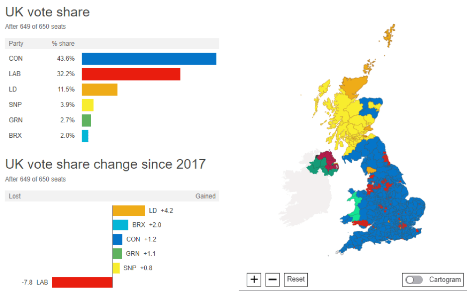 - The UK general election has been decisively won by Boris Johnson’s Conservative party.