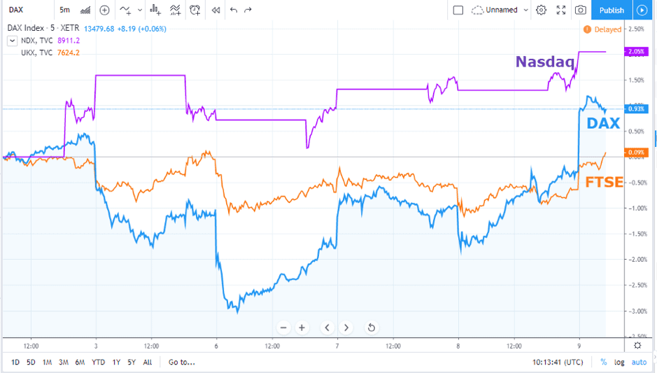 Dax, FTSE100, Nasdaq — index comparison — Five-day chart: