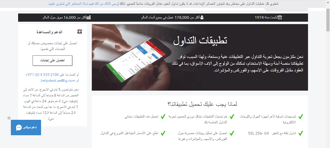 IG هي اختصارل IG Markets Ltd. ، التي تعمل منذ عام 1974. وسيجد أولئك الذين يراجعون IG العديد من الجوائز التي حصلت عليها في تاريخها. وتمتلك الشركة الآن 15 مكتب مبيعات موزعة على خمس قارات ، جذابة للعملاء في جميع أنحاء العالم. يمكن للمتداولين الذين يستخدمون IG الوصول إلى أكثر من 16000 سوق بالإضافة إلى العديد من المنصات والمواد التعليمية.