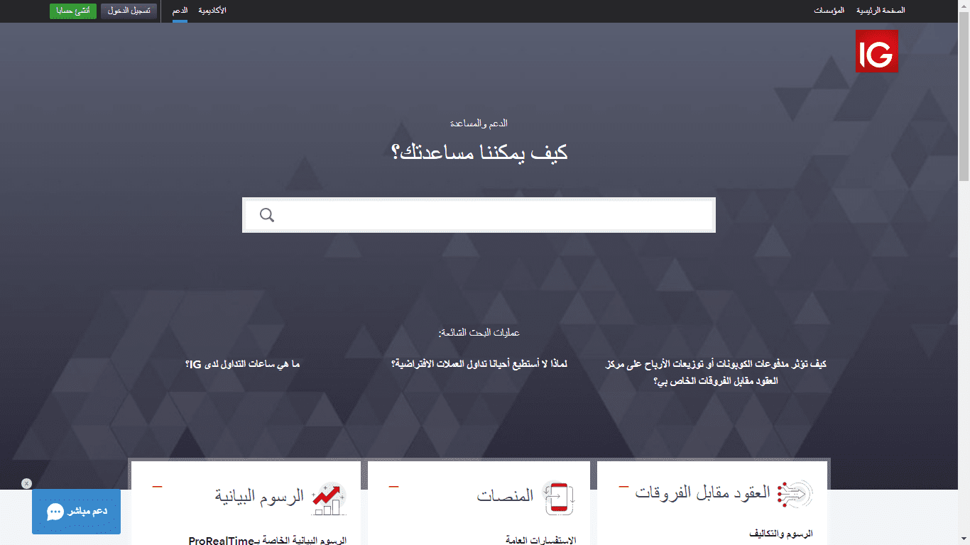 يمكن للمتداولين الاتصال بـ IG عبر الدردشة المباشرة أو البريد الإلكتروني أو رقم هاتف متوفر 24/5. هناك أيضا خيار لملء نموذج الاتصال.