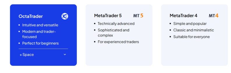 Octa caters to the majority of investors through a wide array of platform options, which include MetaTrader 4, MetaTrader 5 and OctaTrader, all of which are available through web, desktop and smart devices on iOS and Android. A free demo account allows potential clients to acclimatise to the trading environment.