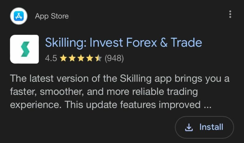 On the App Store, Skilling has a 4.5-star rating from 948 total reviews. On the Google Play Store, the Skilling App has more than 100,000 downloads with a 4.2-star rating from almost 700 reviews. Skilling’s trading app is designed to meet the needs of both beginners and advanced traders. The latest version of the app has a “signal links” sharing option where traders can share orders and positions as signal links with enhanced snippets. On the App Store, the Skilling app only has one review (five stars).