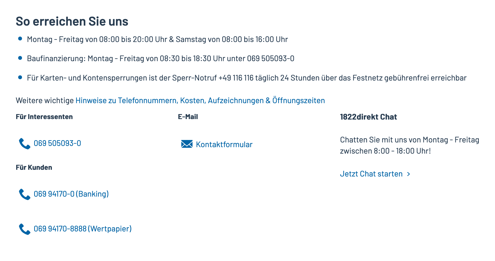 Bei der Suche nach einem geeigneten Wertpapierdepot kommt es auch auf einen guten Service an, denn falls es beim Trading zu Fragen oder Problemen kommen sollte, benötigen die Kunden einen kompetenten und gut erreichbaren Ansprechpartner. Daher haben wir auch diesen Punkt bei unserem Broker Vergleich berücksichtigt. Der Kundenservice von 1822direkt ist per Mail oder zum Ortstarif unter der Telefonnummer 069 94170 8888 erreichbar. Ein kostenloser Rückruf-Service wird ebenfalls angeboten.