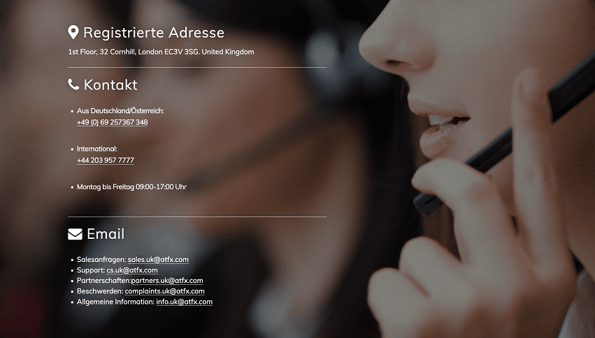 An fünf Tagen in der Woche können Kunden von ATFX den Kundensupport zwischen 9:00 und 17:00 Uhr erreichen. Der Service steht in diversen Sprachen zur Verfügung, darunter sind neben Deutsch auch die Sprachen Italienisch, Spanisch und natürlich Englisch. Für Kunden aus Österreich und Deutschland stellt der Broker eine separate Kontakt-Rufnummer bereit. Daneben gibt es eine „internationale“ Telefonnummer.