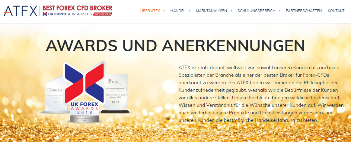 Schon beim ersten Blick auf die Website sticht eine wichtige Auszeichnung ins Auge. ATFX wurde bei den UK Forex Awards in der Kategorie „Bester Forex Broker“ zum Sieger im Jahr 2018 gekürt. Bei den Erfahrungen mit ATFX fanden sich noch weitere Auszeichnungen, die der Broker in den vergangenen Jahren für überzeugende Leistungen erhielt. Im Jahr 2017 konnte der Broker gleich mehrere Testsiege für sich in Anspruch nehmen. Dazu gehört unter anderem die Auszeichnung „Best Branded Broker 2017“ von Shenzhen Huihu Financial.