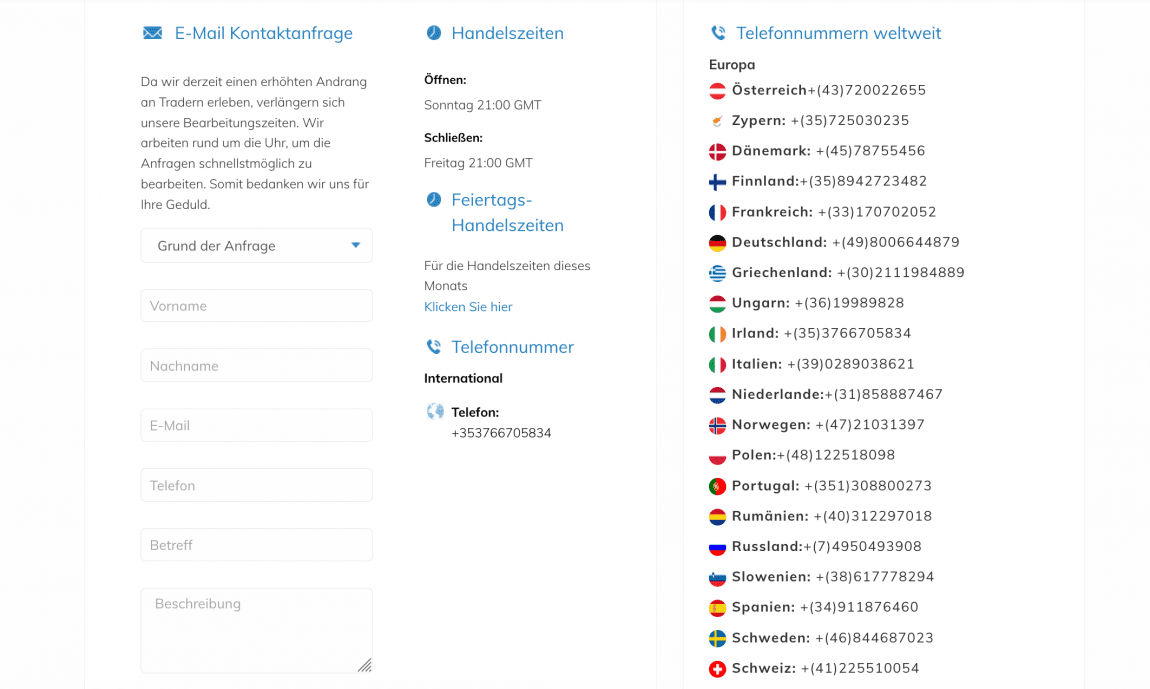 Auf seiner Seite weist der Broker darauf hin, dass sich die Beantwortung von Anfragen aufgrund des erhöhten Andrangs verzögern kann. Der Broker arbeitet nach eigenen Angaben aber rund um die Uhr, um alle Fragen schnellstmöglich zu beantworten. Wer das Online- bzw. E-Mail-Kontaktformular auf der Webseite nutzen möchte, muss neben dem „Grund der Anfrage“ auch den vollständigen Namen, die E-Mail-Adresse, eine Telefon-Nummer und einen Betreff auswählen. Die „Beschreibung“ des Anliegens kann in einem gesonderten Feld vorgenommen werden. Die Anfrage wird dann direkt an den Vertrieb des Unternehmens gesendet.