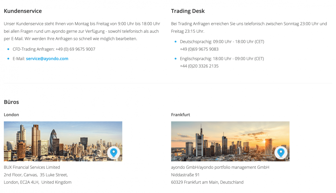 Der Kundenservice ist unter der Woche von 09:00 bis 18:00 Uhr erreichbar und beantwortet alle Fragen zu ayondo und den Angeboten. Der Broker bietet dafür zum einen eine E-Mail-Adresse als Kontaktmöglichkeit an. Natürlich können Trader auch den Telefonsupport in Anspruch nehmen. ayondo bietet zwei unterschiedliche Nummern für das CFD Trading und Social Trading.
