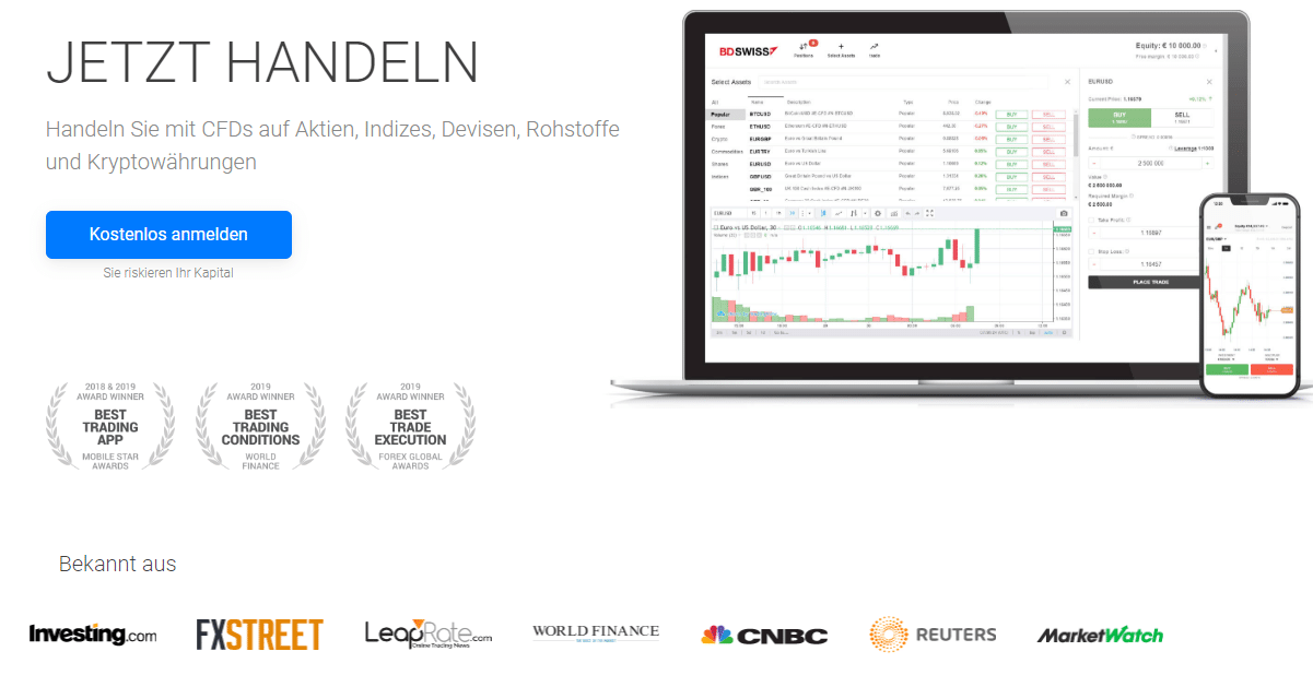 BDSwiss ist, wie der Name verrät, ein Schweizer Forex- und CFD-Broker, unterhält sein Hauptbüro mittlerweile allerdings auf Zypern. Der CySEC-regulierte Anbieter ermöglicht seinen Kunden BDSwiss Erfahrungen mit Forex, CFDs und Kryptowährungen zu machen. Insgesamt drei Kontotypen mit unterschiedlichen Marktmodellen werden angeboten, zu günstigen, variablen Spreads. Auch bei der Software und beim Schulungsangebot kann der Broker im BDSwiss Test überzeugen. Hinzu kommt ein guter, kompetenter Kundensupport und die wohlwollende Bewertung durch die Fachpresse, die sich in den Auszeichnungen des Brokers niederschlägt. Unser BDSwiss Testbericht beleuchtet alle Facetten des Angebots.