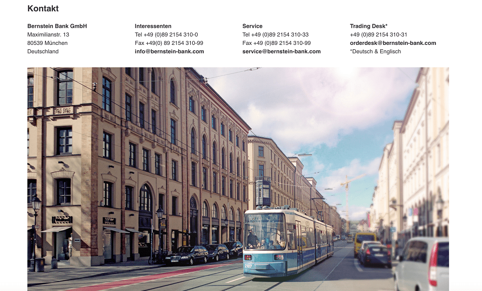 Die Bernstein Bank GmbH wurde erst im April 2016 in München gegründet und zählt damit zu den jüngsten Forex- und CFD-Brokern in Deutschland. Der Unternehmenssitz befindet sich in der deutschen Großstadt München, in der Maximilianstraße. Weitere Filialen in anderen Ländern gibt es aktuell nicht. Auf der Internetseite des Brokers ist zu erkennen, dass sich das Handelsangebot an Trader aus aller Welt richtet. Dazu zählen auch Händler aus Italien, Polen oder Tschechien. Hierzu muss erwähnt werden, dass die Bernstein Bank in sämtlichen EU-Ländern die Erlaubnis erhalten hat, Finanz- und Bankleistungen anzubieten.