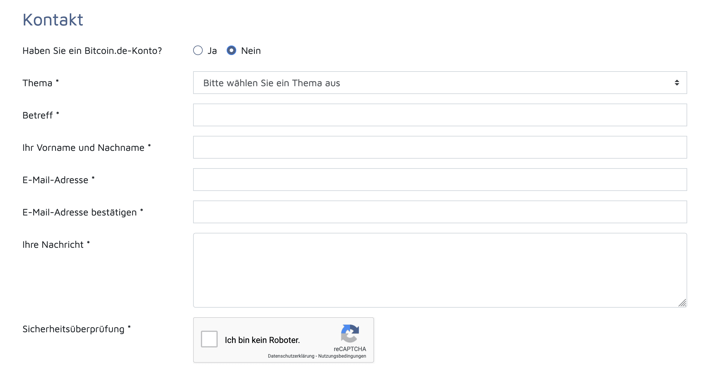 Nutzer von Bitcoin.de können sich bei allgemeinen Fragen zunächst in den FAQ umschauen. Hier werden viele wichtige Fragen bereits beantwortet. Sollte eine bestimmte Frage nicht darunter sein, ist der Kundenservice von Bitcoin.de über das Kontaktformular auf der Website erreichbar. Der Service erfolgt in deutscher Sprache. Eine Kontaktaufnahme per Telefon oder Live-Chat ist nicht möglich, was zu Verzögerungen führen kann.